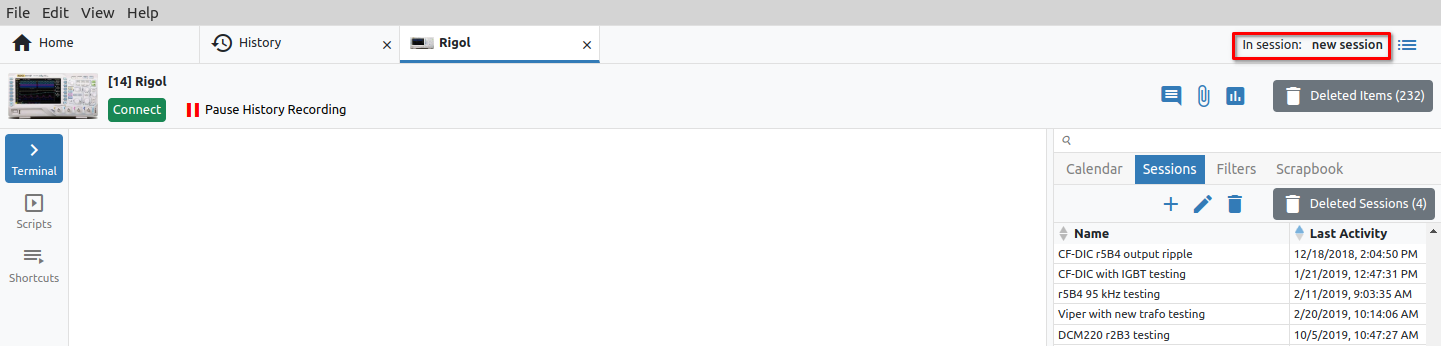 An indication of an active session will be visible in any Instrument tab. In the example in Fig. 5 shows that the session with the name new session is active.
